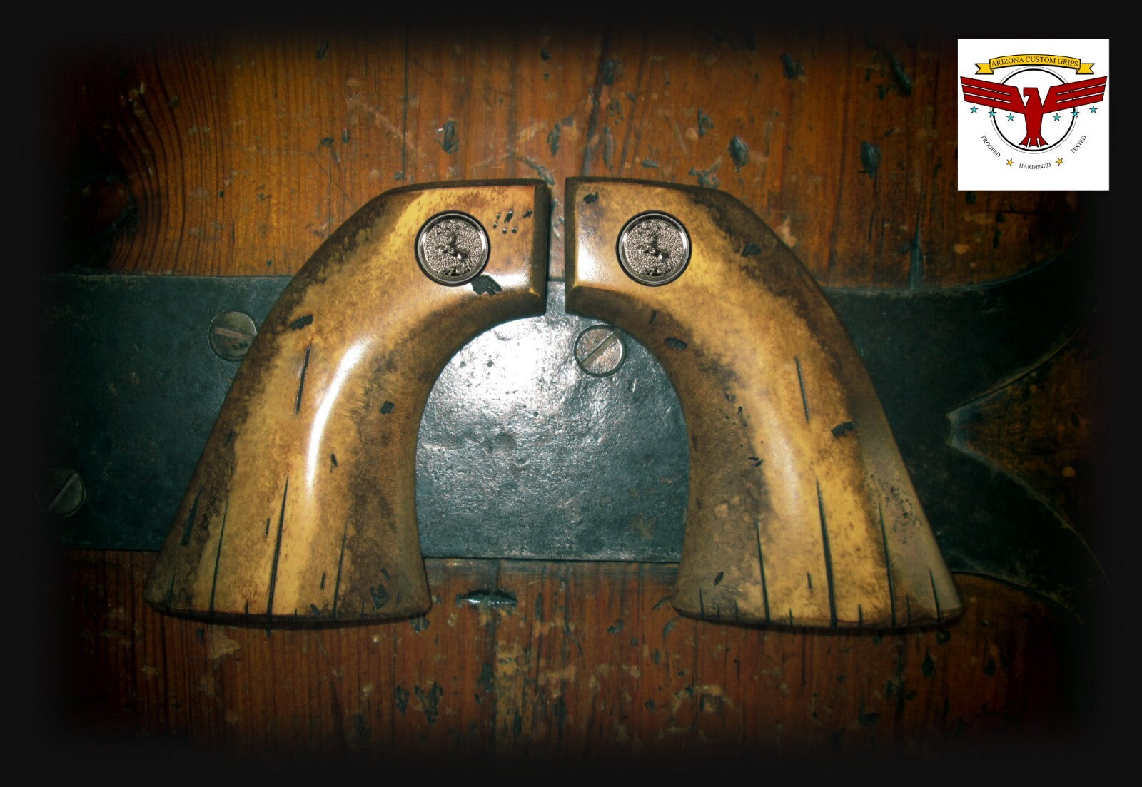 This auction is for a set of Genuine Aged Magna-Tusk ™ Ivory grips for ANY of the current or former Uberti made Colt SAA style revolvers. This includes any of the 1873 Single Action Cattleman series, the Stallion, the Buntline, any of the El Patron series, the Cattleman .22, the Horseman, the 1873 Cattleman II, SASS Pro, CMS Pro, Evil Roy, or any of the other Uberti “plowhandle” style pistols, including anything sold by Cimarron, Taylors, Navy Arms, EMF, Stoeger, or any of the other importers. The purchase price includes full custom fitting in our shop. After custom fitting, the grips will be aged with our exclusive aging process, to impart the authentic “Old West” Ivory patina that Arizona Custom Grips has become famous for. We have fully developed this process and have a vast amount of experience in doing it right.