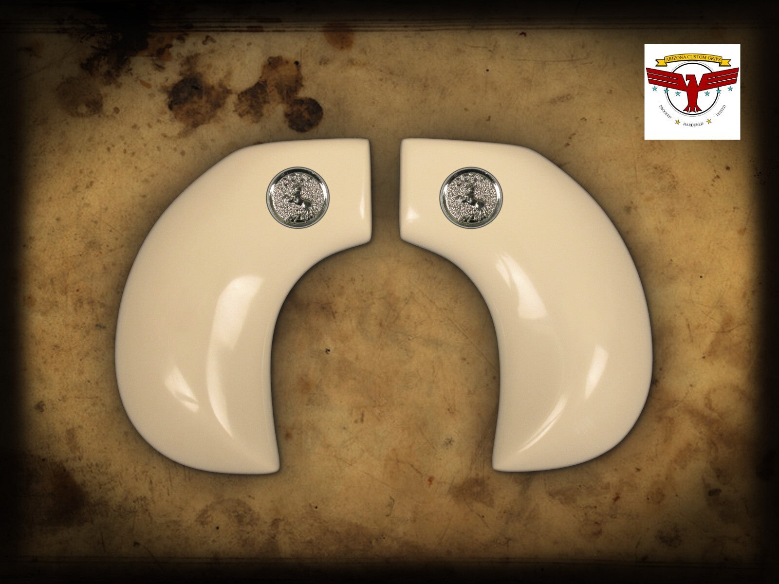 Magna-Tusk™ Ivory and Stag grips, a product of Arizona Custom Grips, are manufactured out of our high-grade, high density ivory material designed from the beginning as a premium, high-strength grip material.  Vastly superior to standard bonded ivory or stag found on most factory and other aftermarket grips, Magna-Tusk™ is capable of withstanding the heaviest recoil and impact, and is the toughest alternative grip material available today, while still retaining the pristine look of real ivory or stag.  It is rock-solid, stable, and water, chemical, and oil resistant.  It is flame and heat resistant, and is entirely void-free, with over 10x the strength, durability, and impact resistance of alternative materials.  Unlike with real ivory or stag, there is no routine care and maintenance involved, with no danger of it drying out and cracking if not maintained properly or if left in the heat.  It is filled with premium natural compounds to produce outstanding aesthetic properties and mechanical performance.  When aged with our natural aging process, it takes on the equivalent of a 100-year-old patina, with subtle grain details which many experts cannot tell apart from the real thing.  In addition, the material has a fine grain structure, which holds intricate detail for carvings, artistic relief work, etc., found on many historic grips.