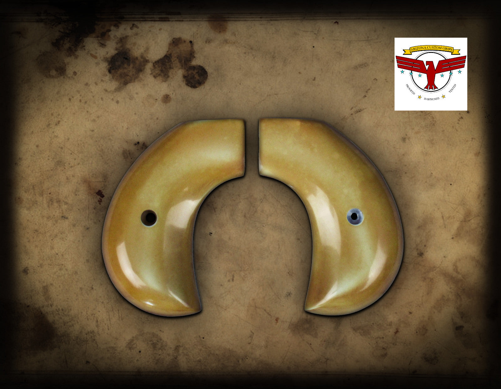 Magna-Tusk™ Ivory grips, an exclusive of Arizona Custom Grips, are manufactured out of a super high-grade, ultra-high density Ivory material developed exclusively for our premium grip production. Vastly superior to standard bonded ivory found on factory and other aftermarket Ivory grips, Magna-Tusk™ is capable of withstanding the heaviest recoil and impact, and is the toughest alternative ivory material available today, while still retaining the pristine look of real ivory. It is completely rock-solid, stable, and water, chemical, and oil resistant. It is flame and heat resistant, and is entirely void-free, with over 10x the strength, durability, and impact resistance of alternative materials. Unlike with real ivory, there is no routine care and maintenance involved, with no danger of it drying out and cracking if not maintained properly or if left in the heat. It is filled with premium natural and synthetic compounds to produce outstanding aesthetic properties and mechanical performance. When aged with our exclusive aging process, it takes on the equivalent of a 100-year-old patina, with subtle grain details which many experts cannot tell apart from the real thing. In addition, the material has a fine grain structure, which holds intricate detail for carvings, imitation stag, etc., found on many historic grips.