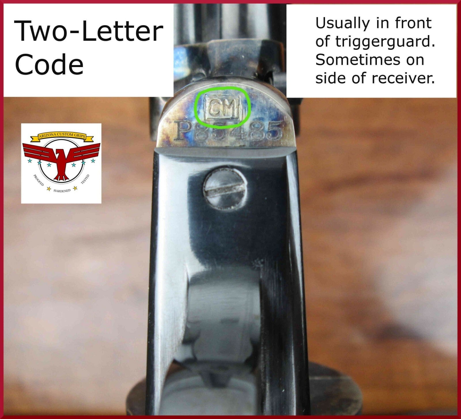2)  Right in front of the trigger guard on the underside of the revolver, above the serial number, is a two-letter or two-number code in a square box (i.e., “BU”, “CN”, "20", etc.).  Please send us the letters in the box as this will give us important additional information about the variation of your grip frame, including profile and milling cuts needed.